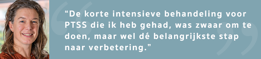 De korte intensieve behandeling voor PTSS die ik heb gehad, was zwaar om te doen, maar wel dé belangrijkste stap naar verbetering. Eerder had ik wekelijkse sessies, maar ik kon me er niet goed aan overgeven. Mezelf in een uurtje binnenstebuiten keren en daarna weer op de fiets stappen om door de stad naar huis, werk, sport te gaan, ging gewoon niet voor mij. Ik voelde ook dat het niet opschoot op die manier. Een collega wees me op het bestaan van de intensieve behandeling. Die ben ik daar heel erg dankbaar voor!