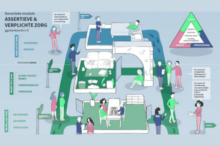Samen met patiënten, naasten en professionals is onder begeleiding van Akwa GGZ de kwaliteitsstandaard voor het verlenen van verplichte of assertieve zorg herzien. Bij assertieve of verplichte zorg is er altijd sprake van een ernstige en complexe situatie. Daarom is er een generieke module Assertieve en verplichte zorg die de weg van vrijwillige zorg via assertieve zorg naar verplichte zorg en weer terug beschrijft.