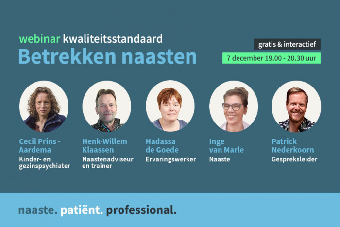 Naasten hebben een belangrijke rol in het herstelproces van mensen met psychische of verslavingsproblematiek. Daarom is er een generieke module Naasten over de samenwerking met én ondersteuning van naasten. Om kennis te maken met de vernieuwde standaard organiseert Akwa GGZ een gratis interactief webinar op dinsdag 7 december om 19.00 uur. Hoe kun je als professional naasten zo goed mogelijk betrekken én ondersteunen. Welke elementen en hulpmiddelen uit de vernieuwde standaard zijn behulpzaam voor professional, patiënt en naaste.