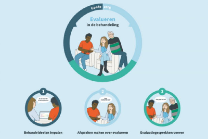 Akwa GGZ helpt professionals om het verloop van de behandeling en het herstel te bespreken met de patiënt. Door evaluatie in de behandeling krijgen professional meer zicht op de voortgang en effectiviteit van de behandeling en kan er tijdig worden bijgestuurd. Er is veel informatie verzameld en er zijn hulpmiddelen beschikbaar, zoals een folder en online evaluatie-ondersteuning: een hulpmiddel om behandeldoelen te bepalen en een evaluatieplan op te stellen. Maak hier gebruik van!