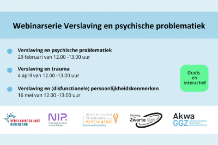 Om kennis over dit onderwerp te vergroten en de samenwerking te versterken organiseren Verslavingskunde Nederland, NIP, NVvP, Stichting het Zwarte Gat en Akwa GGZ drie gratis lunchwebinars.