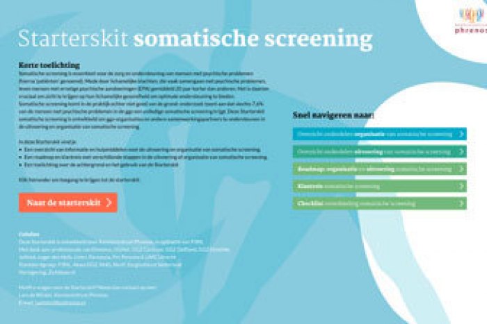 Mensen met ernstige psychische problemen hebben vaak ook lichamelijke klachten, maar deze worden regelmatig over het hoofd gezien. De starterskit is een praktisch hulpmiddel om de organisatie en uitvoering van somatische screening in te bedden in je organisatie. Kenniscentrum Phrenos heeft in opdracht van P3NL deze Starterskit ontwikkeld. Het is onderdeel van het project Zinnige Zorg.