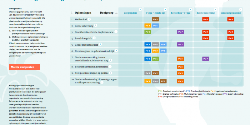 Om zorgverleners in de (gespecialiseerde) ggz en de huisartsenzorg te ondersteunen, heeft Kenniscentrum Phrenos in opdracht van Zorginstituut Nederland een digitaal overzicht met praktijkvoorbeelden voor somatische screening ontwikkeld. Alle negen praktijkvoorbeelden bevatten onderliggende documenten en hulpmiddelen zoals bijvoorbeeld stappenplannen, handreikingen, voorbeeldbrieven en e-learning tools. Naast dit digitale overzicht met tips en tools heeft Kenniscentrum Phrenos ook een eindrapportage gemaakt met meer achtergrondinformatie.