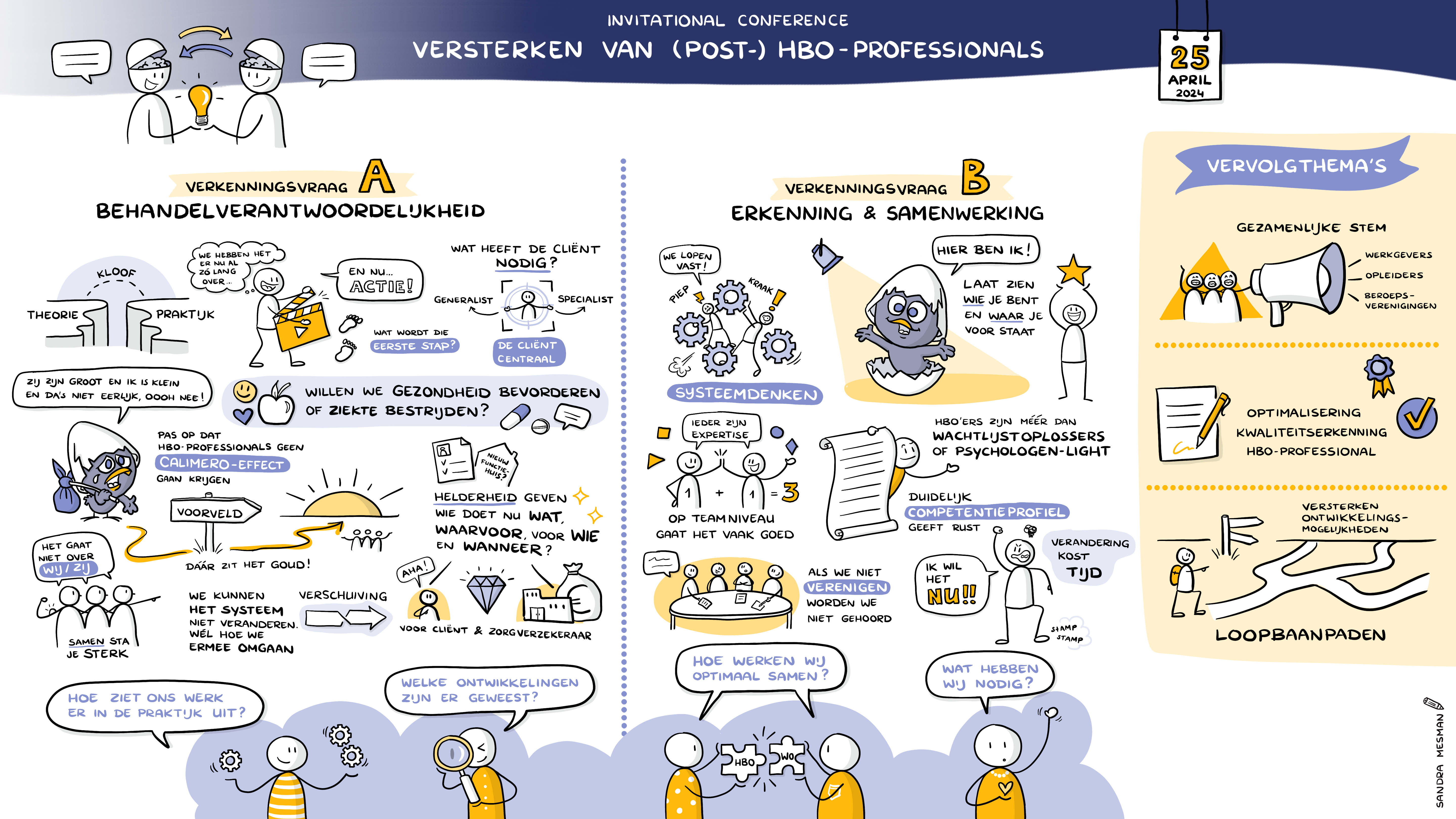 De tekening presenteert de verschillende inzichten, beschouwingen en vragen die tijdens de bijeenkomst naar voren kwamen. Aan de rechterkant worden vervolgthema's voor toekomstige stappen aangegeven.Deze drie thema's bieden een richting voor toekomstige acties en verdere professionalisering van hbo-professionals binnen het zorgsysteem: